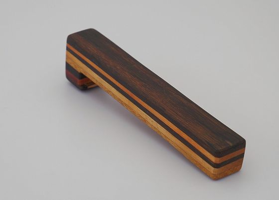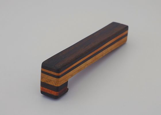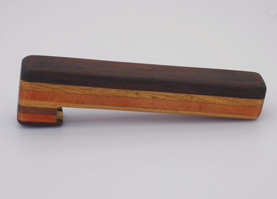 Aus unterschiedlichen Hölzern verleimter Flaschenöffner mit Messingeinsatz und Magnethalter für den Kronkorken.