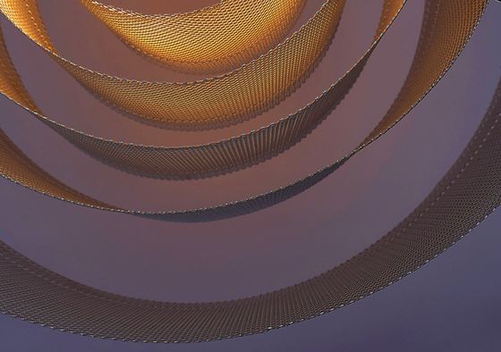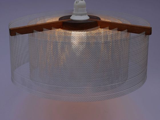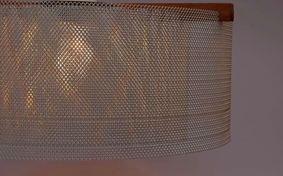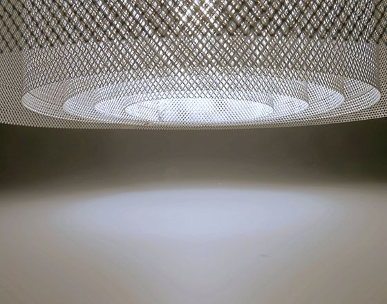 Eine transluzide Aluminiumstruktur wird, mit kreisförmigen Ringen, um das Leuchtmittel angeordnet. Durch die unterschiedlichen Abstände der Ringe entsteht ein gedämpftes Lichtbild zu den Seiten mit Tiefen-Effekt durch die einzelnen Schichten.