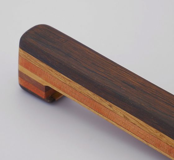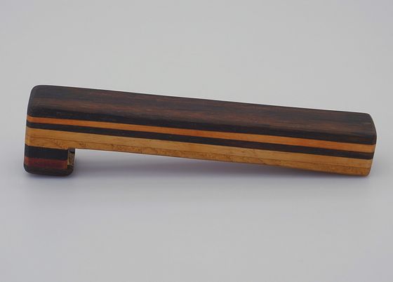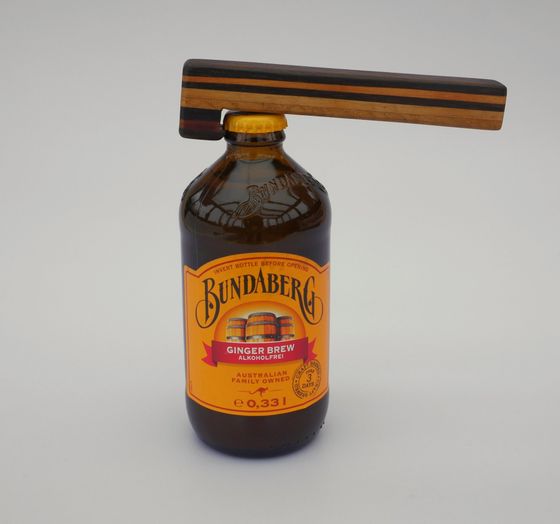 Aus unterschiedlichen Hölzern verleimter Flaschenöffner mit Messingeinsatz und Magnethalter für den Kronkorken.